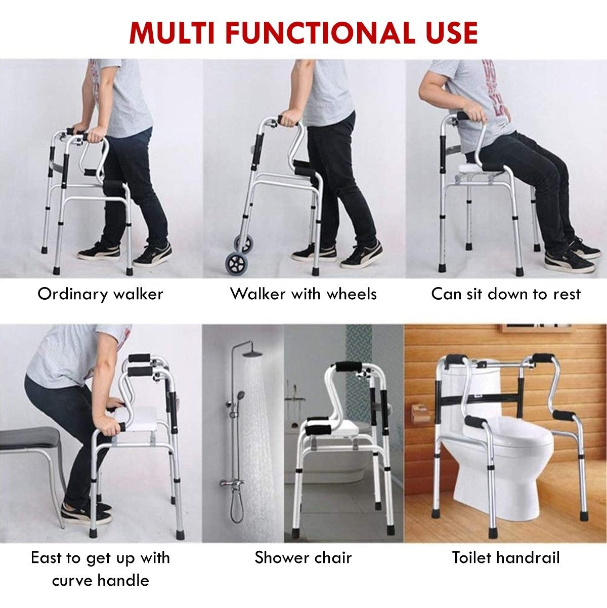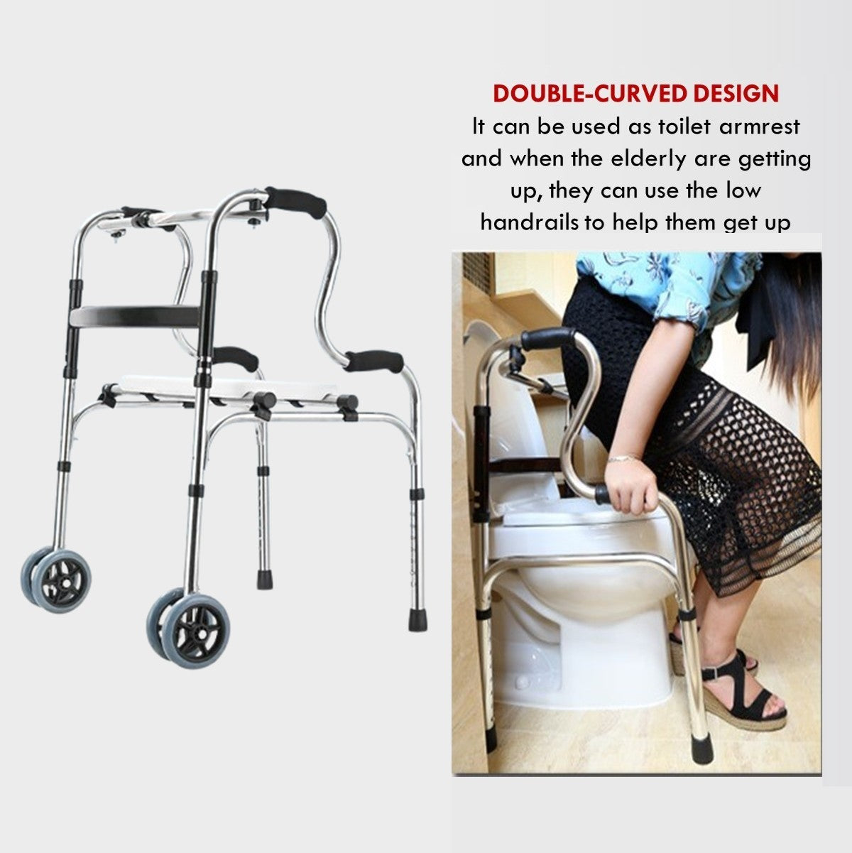3 in 1 Adjustable Foldable Elderly Walking Frame Toilet Support with Shower Board and Wheels